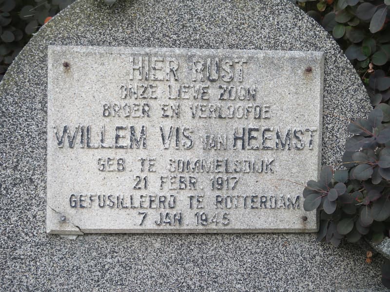 Willem Vis van Heemst woonde in Sommelsdijk. Hij werd op 21 februari 1917 geboren als zoon van Johannes Vis van Heemst (19 november 1870, Sommelsdijk - 17 februari 1943, Sommelsdijk) en Anna Cornelia Zaaijer (25 april 1879, Dirksland). Hij werkte als timmerman/landbouwer. Op 20 december 1944 werd hij tijdens een razzia gearresteerd en korte tijd later wist hij te ontvluchten. In januari 1945 werd hij opnieuw gevangen genomen in Rotterdam. Op 7 januari 1945, werd hij met negen anderen gefusilleerd als represaille op het overlijden van een Duitse soldaat. Deze militair was op 6 januari doodgeschoten tijdens een overval op een villa aan de Bergweg Zuid in Bergschenhoek.